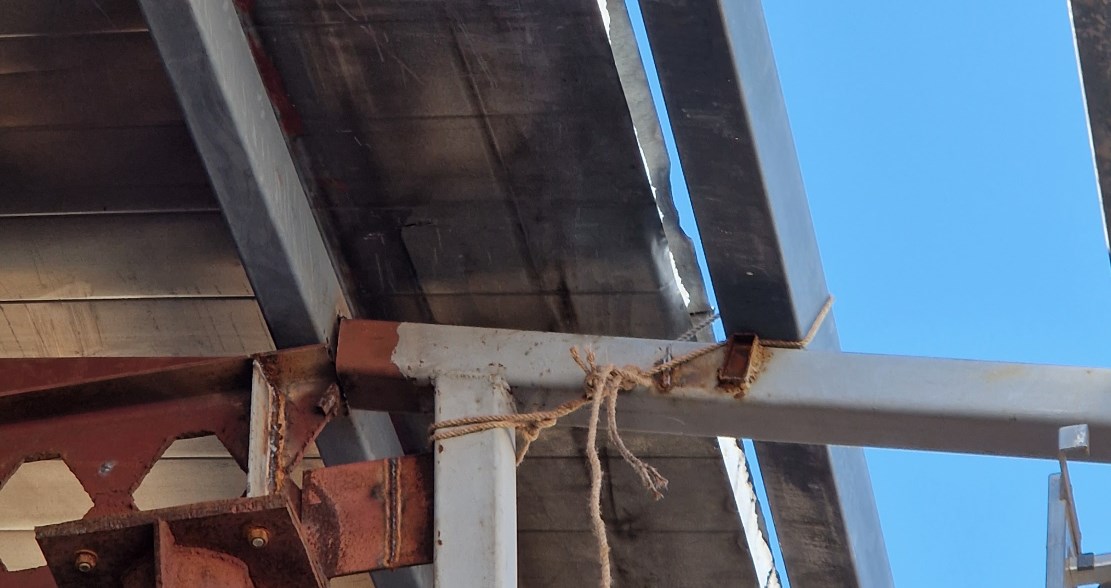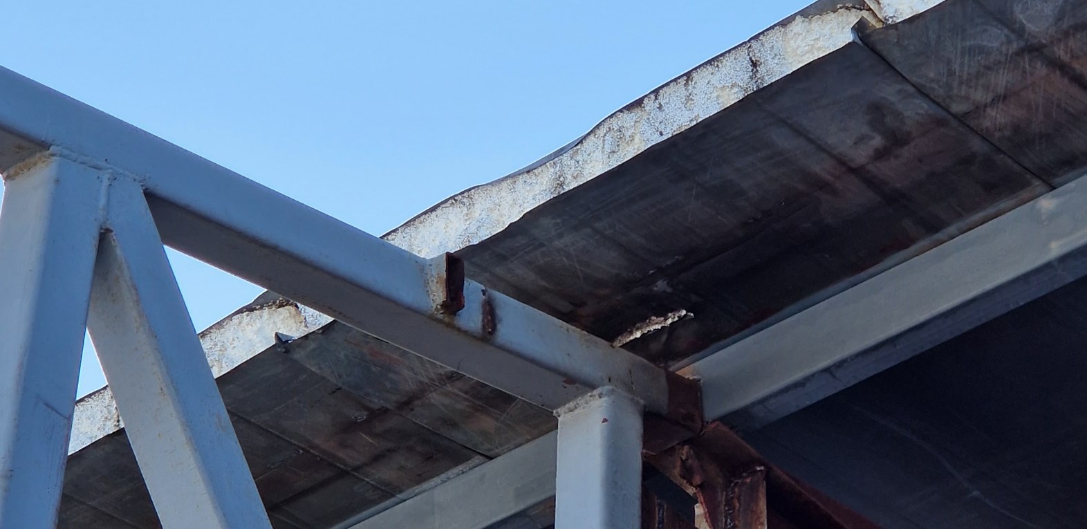 Но тут мы столкнулись с конструктивным косяком предыдущих стоителей этой будки. У них прогоны пристройки были вварены между фермами. А мы хотели положить прогоны на ферму, поскольку это было сильно проще и быстрее в монтаже. Но если положить прогоны на ферму, то высота кровли поднимается на высоту прогона. А в моём случае это 120мм. А если к этой высоте ещё добавить высоту профнастила в 60мм, то этот профнастил оказывается выше, чем верх уже существующей кровельной сэндвич-панели, которая лежит на основной будке Студии. И получается, что нормального стыка там не сделать.