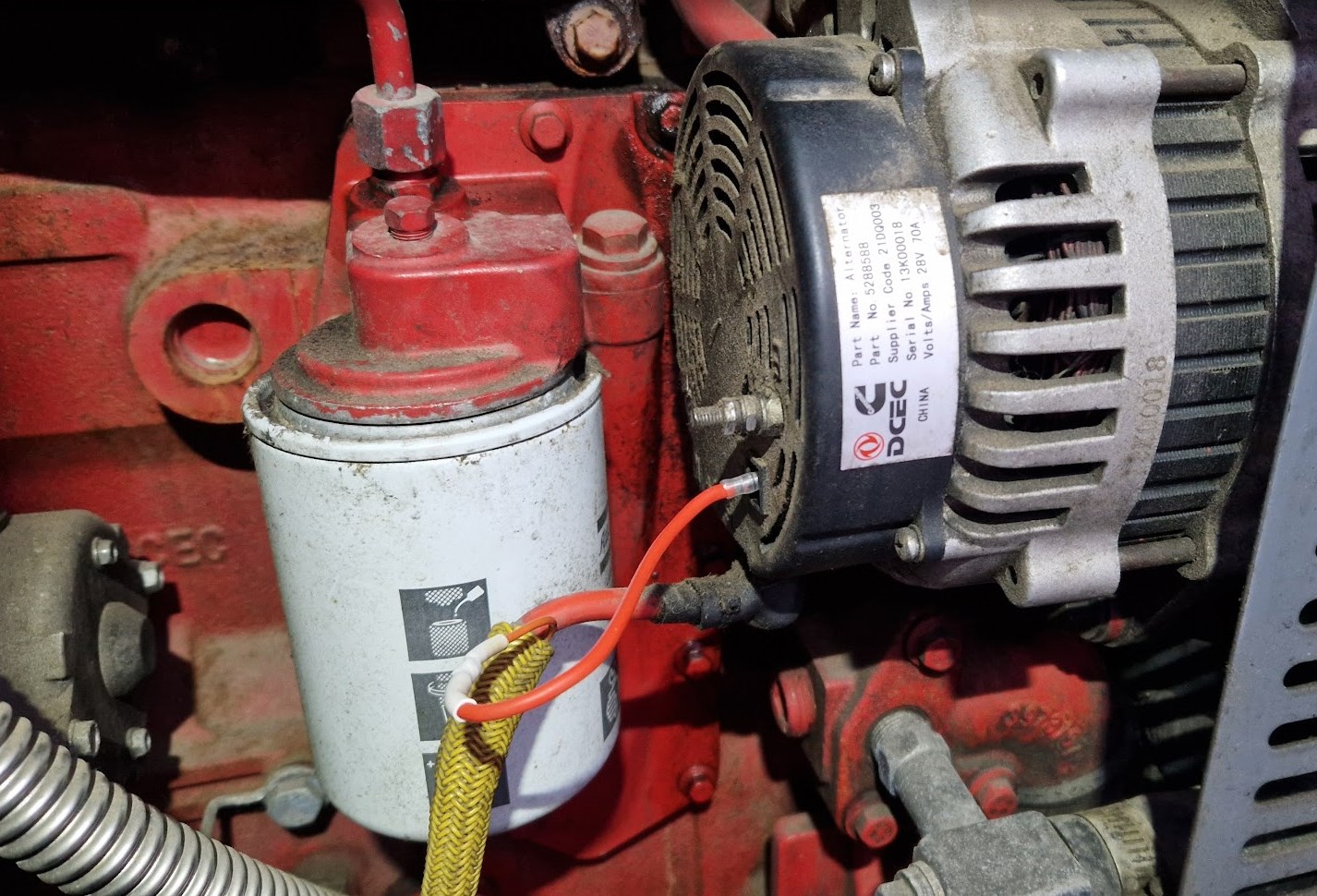 И пока я ходил и переживал о том, сколько времени потребуется на поиск другого датчика давления масла - мой помощник, Илья Николаевич, рассказывающий с самого начала, о том что датчик тут вообще ни с какого боку, сказал, что ему как-то не нравится то, как именно воткнут какой-то нелепый провод в генератор. Только не в тот генератор, который делает настоящее электричество, а в тот, который делает 24VDC для зарядки аккумулятора.