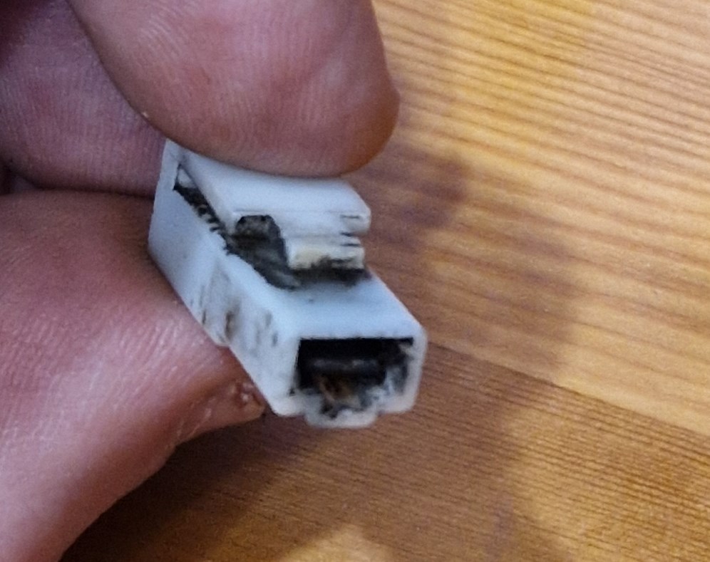 И - да. Он действительно немного вывалился из своего паза. Там была пластиковая защёлка, которая отломилась. А провод проложен был с некоторым натяжением, что вызвало выход клеммы из гнезда. Но не до конца. Ровно настолько, чтобы там пропал контакт.