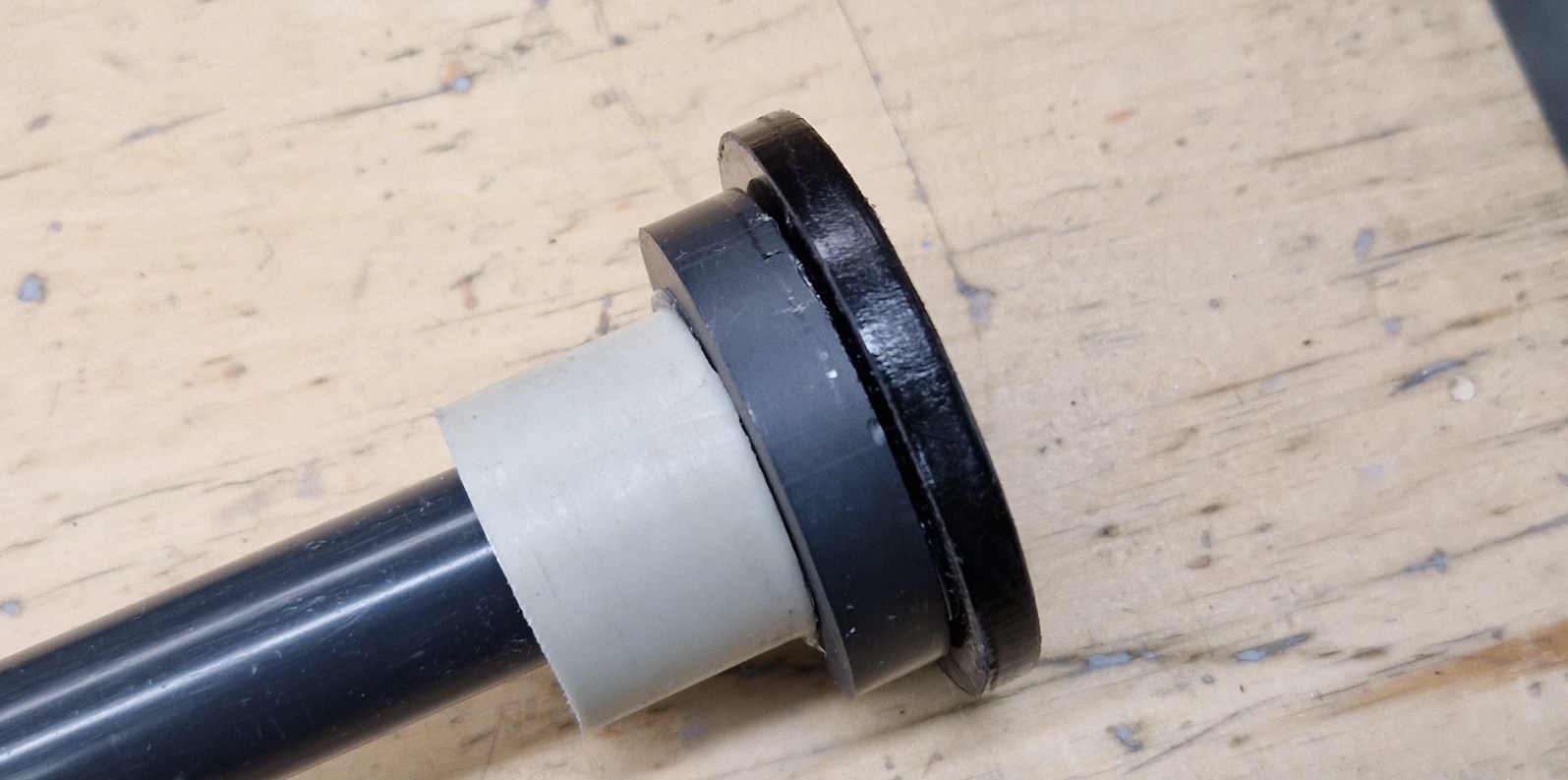 Из ПНД-листа вырезаем изящную шапку для штыря. Делаем новую проставку большей высоты из пропиленовой трубы.