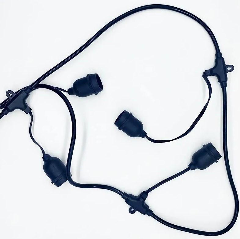 Я купил какую-то странную гирлянду, ценность которой была только в Е27-патронах, которые были выполнены достаточно герметично и имели вход и выход. Сейчас это называется "Белт-лайт". Когда я её покупал - названия ещё не существовало.